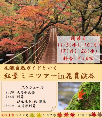 秋の人気スポット「花貫渓谷」を、尾瀬自然ガイドと歩く季節限定ツアー♪紅葉の見所はもちろん、森の小さな植物たち、自然の楽しみ方をガイドがわかりやすくご案内いたします。吊り橋から眺める紅葉、清流せせらぎ、森の澄んだ空気…自然の美しさを五感で味わうひとときをお楽しみください。