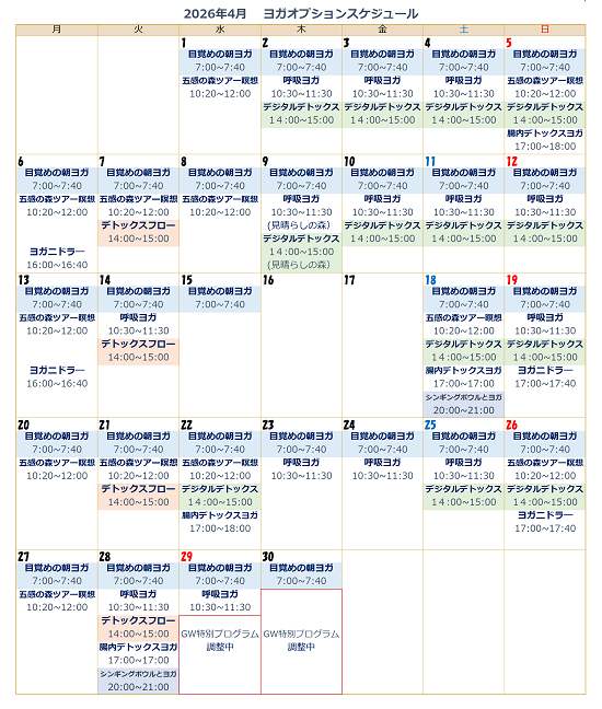 ※全ヨガプログラムは毎月不定期開催となります。予めご了承ください。